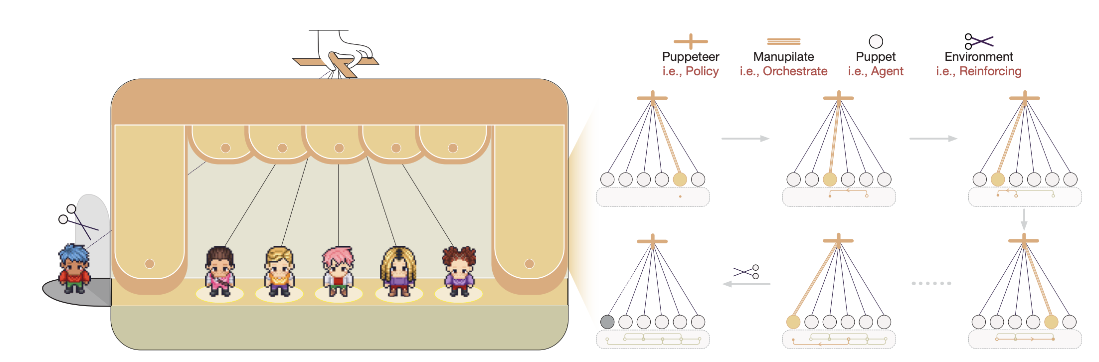 •2025年5月26日:🎉 我们提出了一种新型的“木偶戏”式范式,用于大语言模型智能体之间的多智能体协作。通过利用强化学习优化的可学习中央编排器,我们的方法动态地激活并排列智能体,以构建高效、情境感知的推理路径。这种方法不仅提高了推理质量,还降低了计算成本,使多智能体协作在复杂任务中具有可扩展性和适应性。详见论文:Multi-Agent Collaboration via Evolving Orchestration。